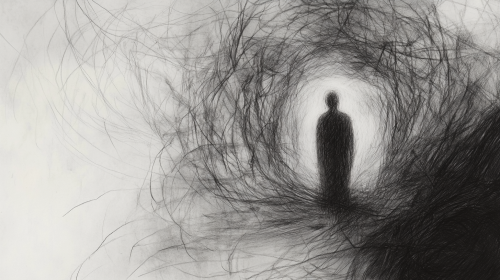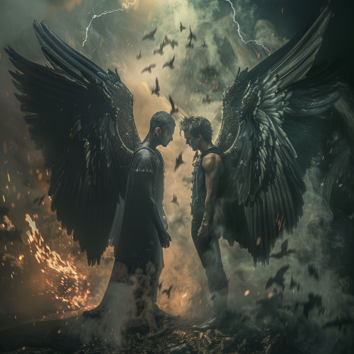 Figure torn between revenge and restraint, divine justice depicted.