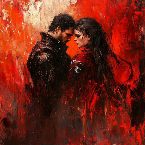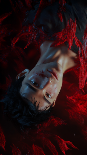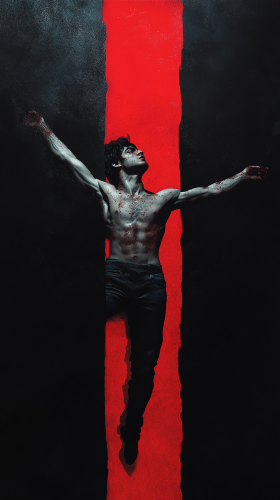 2 sides of the screen black and red background. In the center of the picture is a young man laying in the air, he is pulled to different parts, he is torn between the red and black halves of the picture. He had black hair, quite thick and smooth. His eyes were dark blue, almost black, with a deep and penetrating gaze that often made an impression, especially on women. His face was thin, with sharp features and pale skin, giving him a somewhat delicate and contemplative look. His figure was slim and agile, despite not being physically strong. He wore simple yet well-chosen clothes in stile France in the early 19th century. super detail, ambient occlusion, volumetric lighting, high contrast, HDR, 8K --ar 9:16