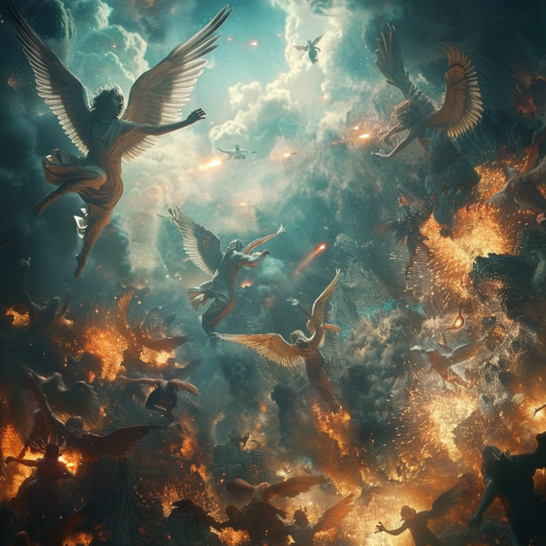 war between angels and demons, the angels attacking from the sky and the demons coming from down underground, cinematic