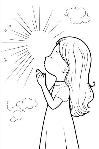 coloring book for kids, simple, children colouring book, no detail, outline no colour, a tender and caring figure of God softly blowing to create a ray of light, splitting the darkness into day and night, simple and bold lines, no gray tones, black and white only, for a coloring page, child-friendly and gentle, suitable for children aged 4 to 10, Catholic theme, fill frame, edge to edge, clipart white background --ar 2:3 --style raw