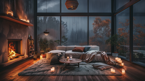 Hyper realistic photo of the most cozy, warm, atmospheric room in the earth. Room in which you can feel of a cozy autumn night in a modern apartment. The room should be slightly mysterious, with a big fireplace, a lot of candles, a lot of laterns, with big white sofa. Soft rain tapping on windows. Room capture the calm, inviting, and slightly eerie feeling of a quiet autumn evening indoors. --ar 16:9 --v 6.0