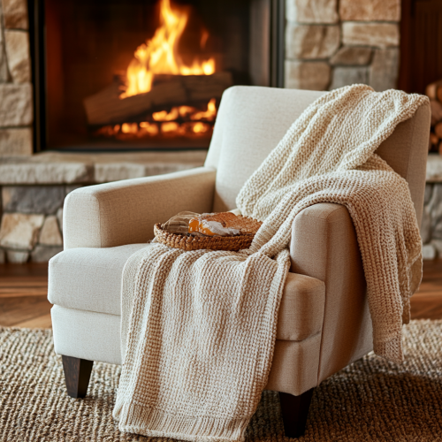 Cozy American living room with a stone fireplace, plush armchair, and a soft throw blanket, warm ambient lighting, slightly blurred to add a welcoming vibe for apparel mockups.