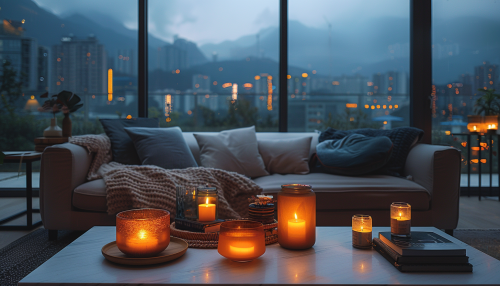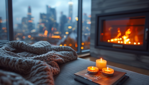 realistic photo of the interior of a modern, spacious apartment in a high-rise building. Despite the modern decor, the apartment is very cozy. Looking at the photo, you would like to give yourself over to relaxation. In the central part there is a fireplace. There are lots of candles and lanterns in the apartment. A thick blanket is loosely placed on a white sofa. On the coffee table there are books and two glasses of wine. Outside the window there is darkness, autumn rain is falling. --ar 7:4 --s 750 --v 6.0
