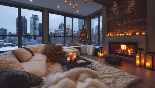 realistic photo of the interior of a modern, spacious apartment in a skyscraper. Despite the modern decor, the apartment is very cozy. Looking at the photo, you would like to give yourself over to relaxation. In the central part there is a fireplace. There are lots of candles and lanterns in whole apartment. A thick blanket is loosely placed on a white sofa. On the coffee table there are books and two glasses of wine. Outside the window it is night and an autumn rain is falling. --ar 7:4 --s 750 --v 6.0