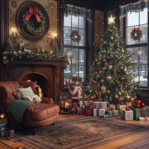 Create a hyper realistic portrait of a Victorian style parlor room set during Christmas 2024. There is large comfortable chez lounge chair with warm throw blankets and pillows near a nice warm fireplace. There is a highly decorated Christmas tree with lots of ornaments and colorful twinkle lights and ribbons and baubles and vintage glass ornaments. There are presents under the tree. There are tall Victorian windows that have a view of the streets as it is snowing now. --v 6.1