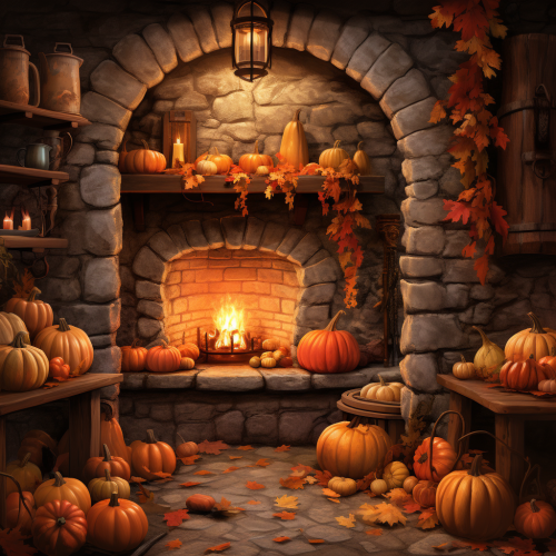 cozy fall firelplace, pumpkins, leaves, candles, stone wall, ar-16x9