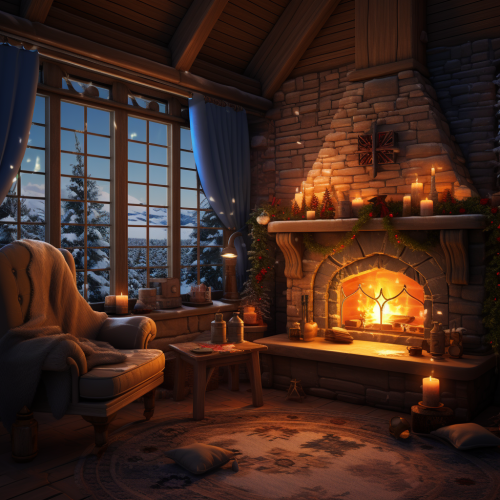 a cozy living room with a fire in the chimney, and a big window on the wall, it's snowing outside --v 5.2