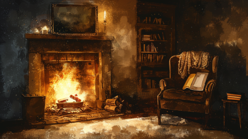 A cozy winter evening by the fireplace, watercolor style, medium shot, relaxing in a warm living room, soft glow of the fire, comfortable armchair and a book, tranquil and serene atmosphere, gentle shadows dancing on the walls --ar 16:9 --v 6.0