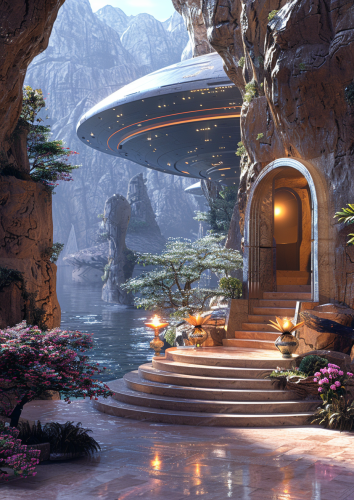 By the fireplace, stories. oriental Creative process image with Chaparral, Flower vase, UFO, oriental style, and a Surreal view --v 6.0 --c 15 --ar 5:7 --s 750