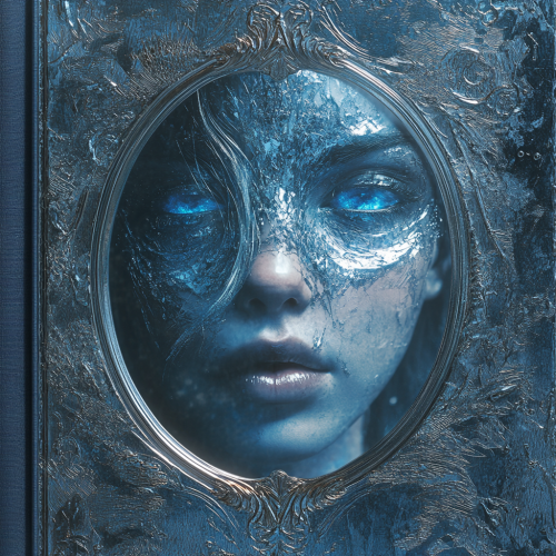 a book cover with a picture of a woman in a mirror, mist art of illusion, featured on art station, made in 2019, online casino logo, illusions, silver and blue color schemes, mind-breaking, identical picture, art for the game, insane intricate, stylized border