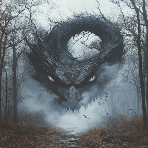 smokey dragon ouroboros eating himself in the background, forest, trees, branches, birds forming a face, optical illusion surreal--style raw --v 6.1 --s 250