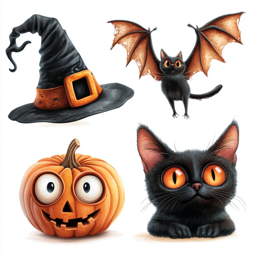 five funny halloween objects, carver pumpkin with disney eyes and black cat, witche's hat, old scary black cat, cute flying bat with , realistic and creepy, isolated on the white background, cartoon, pixar character, white background --v 6.1