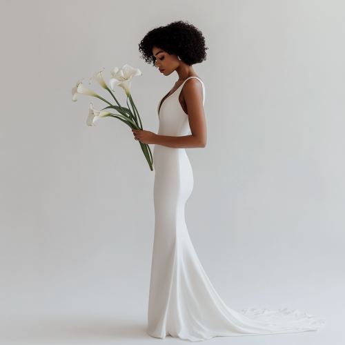 very minimalist wedding dress in lon mermaid style with a very slight and minimal illuson of the accent of a white lily black model, white studio background