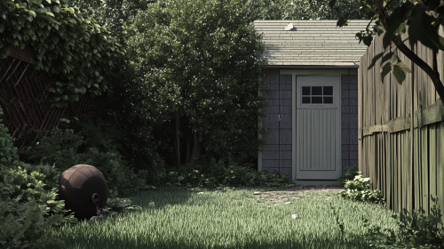a 8k photorealistic forced perspective backdrop that creates an illusion of depth in a realistic backyard scene. The scene should depict the back of a house from a straight-on view, with a single back door as the entrance to the yard. The design must allow for a prop that appears to attach seamlessly to the house. The artwork should be in a trompe-l'œil style with intricate, lifelike details and proper scaling for a convincing sense of depth. --ar 16:9 --v 6.1