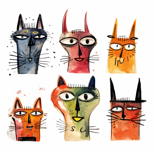 five different type of ugly and furious cat head, different angles, white background, multiple poses and different expressions, ink, scribbling style, by Paul klee