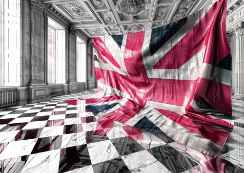 surreal optical illusion, fine art, optical illusion graphic based on a stylised British Flag , geometric illusion in the style of MC Escher, dark Palette, dark Rembrandt accents, deep texture , black lines, checkerboard, highly detailed hyper-realistic, no blurring, no text, no watermark, no signature, no copyright --v 6.0 --ar 7:5 --c 5 --no borders, frames, split frames --weird 200