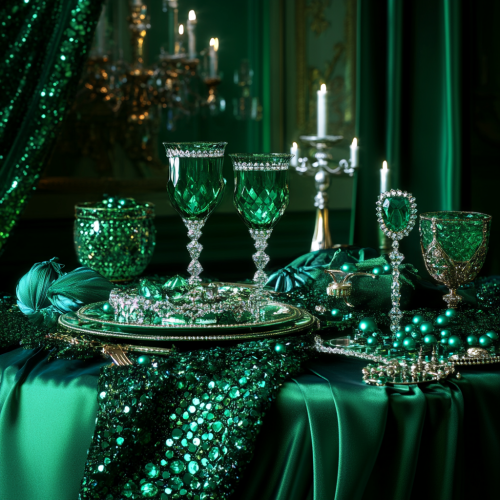 A luxurious and sophisticated scene that captures the essence of emerald beauty and prosperity. The setting could be an opulent environment like a grand ballroom adorned with emerald accents, a lush, emerald-green landscape, or a sophisticated scene featuring emerald jewelry and rich textures. The central focus is on elements that symbolize wealth and elegance, such as sparkling emerald gemstones, lavish décor, or a figure dressed in elegant attire with emerald details. The background features rich, deep greens, sparkling golds, and dark, contrasting tones to highlight the opulence and refinement. Subtle details like intricate patterns, soft light reflections, or elegant textures add to the atmosphere of luxury and fortune. The overall mood is elegant and prosperous, capturing the essence of high value and refinement