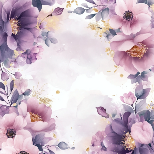 Create a design with pastel-colored flowers in a muted gradient of purple and pink. Include some gold accents and give the design a spiritual, sparkling feel. The design should have a watercolor-style look, with flowers blooming around all four edges and a white space left in the center.