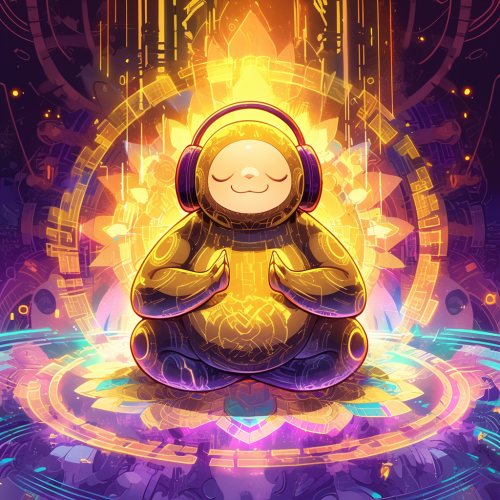 Chibi-style sumo sloth meditating, radiating pulsating, glowing energy that infuses every element of the scene. The sloth is surrounded by vibrant, futuristic digital patterns and mandala-like structures inspired by *The Animatrix*, with glowing, ethereal light in vivid hues of deep emerald, violet, and radiant gold. The sloth has a calm, serene expression with large, expressive eyes and is wearing oversized headphones that pulsate with glowing accents. The sloth is floating slightly above the ground in a sumo pose, exuding an intense sense of inner peace. Swirling electrical currents, alive with dynamic energy, encircle the sloth, as if bending the space-time continuum and shifting spiritual planes. The background is a mix of intricate, otherworldly patterns, spiritual symbols, and powerful energy pulses, creating a harmonious yet intense blend of transcendence and spirituality. The entire scene is infused with life force, pulsating with mana, and glowing with a vibrant energy that captures the essence of transcendental enlightenment. --niji 6