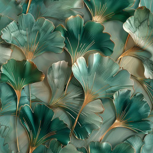 a beautiful image of multiple ginkgo leaves in fluorescent green and gold, in the style of shaped canvas, emerald and beige, hand-painted details, light gray and turquoise, elba damast, floral accents, aquarellist --tile --v 6.0 --s 250