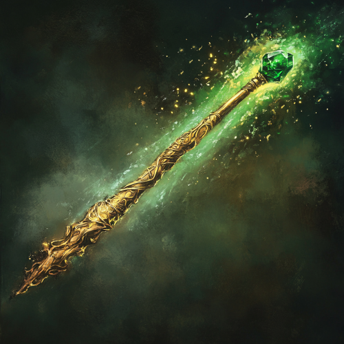 legendary golden magical wand engraved with symbols with a giant emerald on its tip swinging through the air tailing green and gold magic, painted in a grim dark fantasy painting style