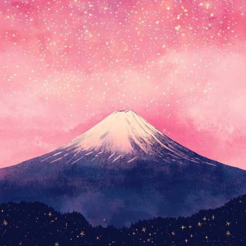 Starry Sky: The starry sky is depicted in tones of pink and rose gold, with sparkling stars scattered throughout. These stars symbolize hope and dreams, creating a happy atmosphere in the night sky. Mount Fuji: Mount Fuji is expressed in a soft rose-colored gradient, with a silhouette that is simple yet powerful. The summit of Mount Fuji is highlighted with a slightly brighter pink, adding a glow reminiscent of a sunrise. Background: The overall background features a rose-colored gradient, transitioning from darker to lighter shades as you move upward. This creates a world filled with happiness and positive energy. Overall Tone: The design is based on a romantic and bright palette of pinks and rose colors, with a touch of gold to add a sense of elegance and hope.