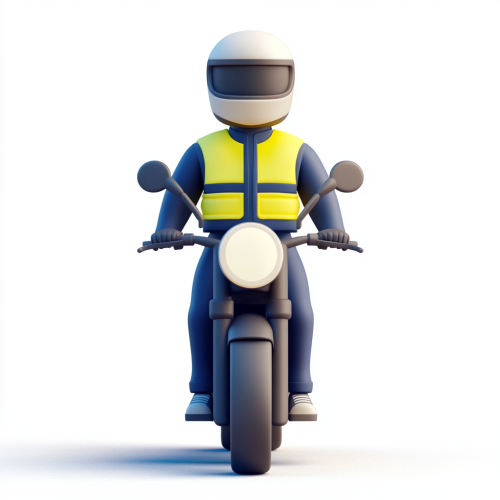 3D rendering icon of motorcyclist in navy blue wearing a yellow neon vest on a white background, flat straight on view, in a clay-like style, with a minimalistic design featuring softened shapes and rounded corners. The material has a matte plastic appearance, with a navy blue and white color scheme. High-resolution photography, Octane render, and studio lighting create an isolated object with soft shadowing and no mockup frame. --ar 1:1