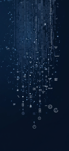 Generate a digital art for Deep navy blue background with small, minimalistic digital art elements such as computer monitors, keyboards, code snippets, and coffee mugs at the edges, in a flat lay arrangement. Use contrasting colors like white, light gray, and pastel blue for the digital art elements to ensure they stand out against the deep navy blue background. Make sure the design is minimalistic and the elements are small to avoid overshadowing the slide content. . --ar 443:960