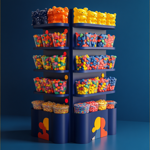 Design a series of creative, freestanding cardboard display stands for Haribo gummy candy products. Each stand should be 1.5 meters tall with a base width of 60 cm, and include multiple shelves or compartments spaced 30 cm apart to display various Haribo products like gummy bears. The design should prominently feature Navy Blue (Pantone 2767 C) as the main color, making it the dominant shade. Use Light Blue (Pantone 298 C), Vibrant Yellow (Pantone 109 C), and Bright Red (Pantone 485 C) as accent colors for details and highlights. Ensure that Navy Blue is the primary color and sets the tone for the stand. Avoid including any logos. Instead, use playful, candy-themed graphics and patterns that are whimsical and engaging. The graphics should reflect the fun nature of the candy and should be placed thoughtfully to enhance the visual appeal. Emphasize the cardboard material by showing visible fold lines and textures to highlight its eco-friendly nature. The background should be omitted, focusing solely on the stand's design and its creative elements. Make sure that the proportions and dimensions of the compartments and the overall stand are accurate to ensure that Haribo products are displayed correctly and attractively.