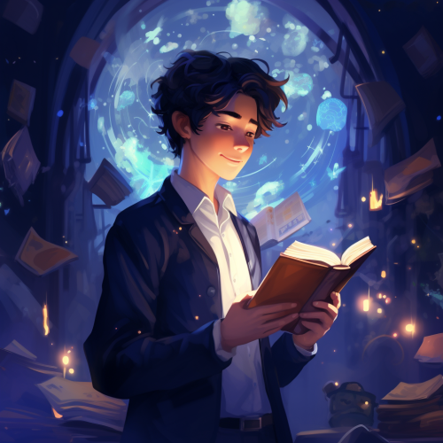 Alex finds a glowing ipad in the midst of all his documents and takes a look into it, flat illustration, light academia, navy blue background