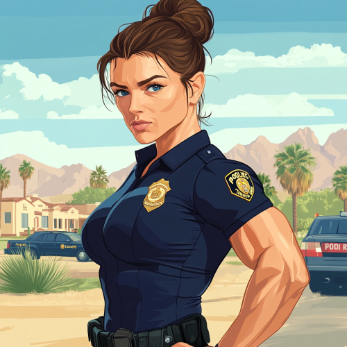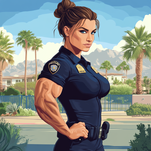 Profile image of an extremely muscular overweight 26 year old female police officer, flat design, dark brown hair in a bun, blue eyes, strong jawline, lip fillers, wearing a tight-fitting navy blue police uniform with badge, exaggerated muscular arms and neck, visible 'roid gut', minimal shading, bold colors, vector art style, clean lines, police Chevrolet Tahoe SUV and suburban desert background with palm trees, upscale homes, golf course, and mountains in the distance, I-10 highway sign visible, Desert Crest community entrance gate, --ar 1:1 --v 6.1
