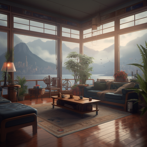 A cozy living room in a large port city on a fertile coastal plain, set between a vast mountain range and the ocean. It's raining heavily outside, creating a misty, atmospheric scene with raindrops streaking down large, shoji-style windows. The city, with its cool Mediterranean climate akin to Northern California or parts of Oregon, features a blend of lush greenery and urban sprawl. The cultural heritage is predominantly East Asian, with a strong Japanese influence, visible in the sleek, minimalist architecture with natural wood elements and clean lines. The living room overlooks an urban landscape with traditional Japanese rooftops and rain-soaked streets. Inside, the space is furnished with low, elegant furniture, soft cushions, and tatami mats, providing a tranquil, inviting contrast to the bustling, rain-drenched cityscape just outside. The overall mood is a harmonious blend of urban energy and serene, rainy-day coziness. --v 5.0