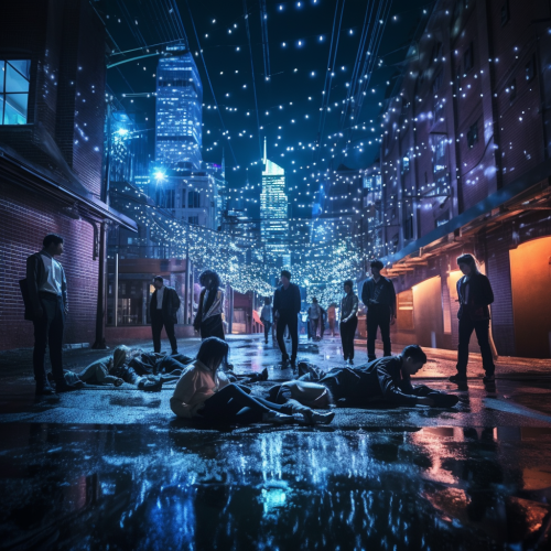 a group of ballet dancers at the end of there performance all lying on the ground in a dark city laneway with the beautiful city scape lights in the background