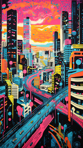 concrete and modern city scape, cement texture, lsd trip, bright neon colours, illustrated style, linocut art, screen print texture --ar 9:16