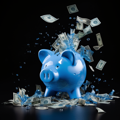 a crystal blue piggy bank, a lot of money falling out, money around piggy bank, too much money fall off of piggy bank