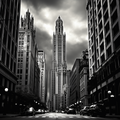 city scape, gothic architecture similar to the tribune tower and the woolworth building, black and white