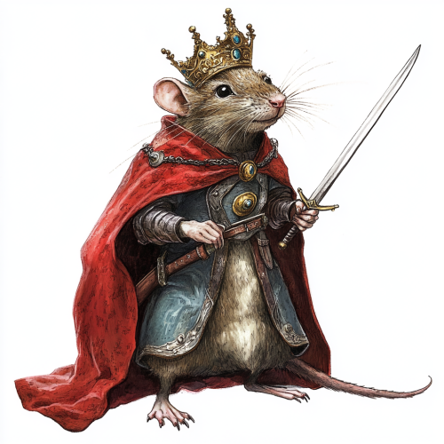 illustration of the rat king from the nutcracker, he is wearing a crown, red cloak and wielding a sword, scandinavian style, isolated on a white background, art style of beatrix potter