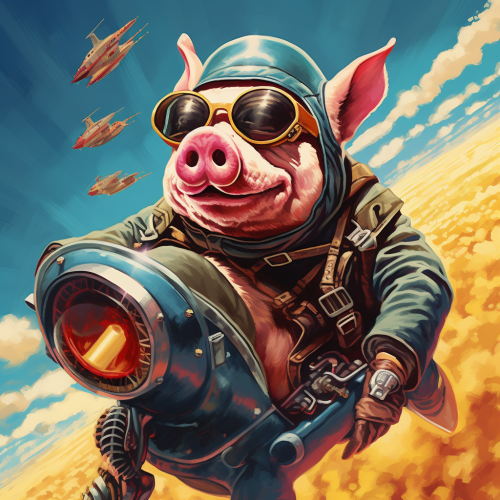 aerial shot of a pig wearing goggles and flying on top of a rocket headed towards space, pop art