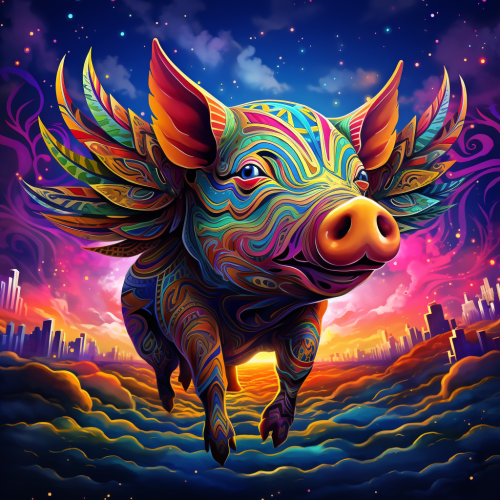 Create an image of a flying pig in a psychedelic art style, with colors reminiscent of the effects of DMT. Imagine vibrant and swirling hues, kaleidoscopic patterns, and a surreal atmosphere that captures the essence of a mind-altering experience. The flying pig should be depicted with a whimsical and dreamlike quality, merging the fantastical with the psychedelic, as if it emerged from the realms of an otherworldly journey