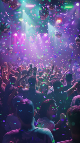 An epic party at a luxurious nightclub, featuring Green Bay Packers NFL players dancing with Brazilian Olympic medalist gymnasts, alongside São Paulo politicians. Neon lights and vibrant lasers flash across the scene, as confetti rains down. Each figure is caught mid-dance, the energy palpable. The background is filled with people cheering, a live DJ spinning in the corner, creating a high-energy atmosphere. Created using: vivid lighting effects, neon glow, dynamic poses, cinematic photography, wide-angle lens, confetti texture, photojournalistic style, vibrant color palette --ar 9:16 --v 6.0