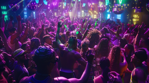 A grand scene in a packed nightclub, Green Bay Packers NFL players dancing with Brazilian Olympic gymnasts under a sea of colorful lights, while São Paulo politicians celebrate in the VIP section. The room is alive with energy, glowing in purples, greens, and blues. The camera captures the epic interaction between athletes and politicians, everyone smiling and raising drinks. Created using: neon club lights, cinematic composition, candid atmosphere, high-energy colors, epic group shot, wide-angle lens, photorealistic details, dynamic lighting --ar 16:9 --v 6.0