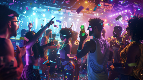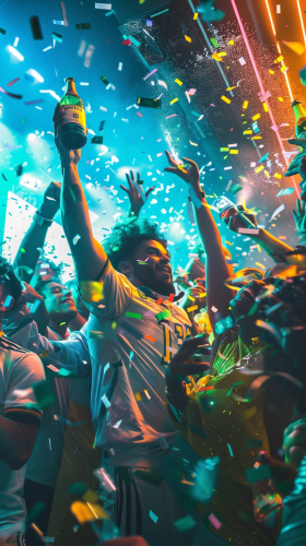 A legendary nightclub scene featuring Green Bay Packers NFL players, Brazilian medalist gymnasts, and São Paulo politicians, all gathered around for a celebratory photo. Neon lights illuminate the room, casting a surreal glow on each figure. Confetti falls mid-air, and everyone is captured in a victorious pose, drinks raised in celebration. Created using: epic lighting, photorealistic detail, celebratory atmosphere, wide-angle lens, candid shot, neon glow, vibrant colors, surreal yet dynamic composition --ar 16:9 --v 6.0