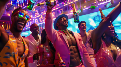 Inside a vibrant nightclub, Green Bay Packers players, Brazilian Olympic gymnasts, and São Paulo politicians are dancing together, with champagne bottles popping, neon lights flickering across their faces. A dramatic, award-winning photo captures the precise moment where everyone is cheering. The background features a massive LED screen, adding to the high-energy feel. Created using: vivid lighting, motion capture, high-energy poses, photorealistic style, dynamic color palette, cinematic detail, photojournalism, iconic moment --ar 16:9 --v 6.0