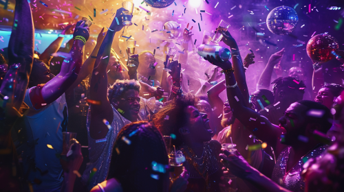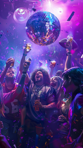 A moment of celebration inside a high-energy nightclub, Green Bay Packers players toasting with Brazilian Olympic gymnasts and São Paulo politicians. The lighting is dramatic, with deep purples and blues illuminating the scene, while a disco ball scatters light across the crowd. Each person is captured in a candid yet iconic pose, their expressions full of joy and triumph. Created using: cinematic lighting, realistic detail, candid expressions, photojournalism style, club atmosphere, motion blur, vibrant tones, high-energy composition --ar 16:9 --v 6.0