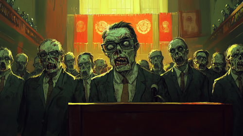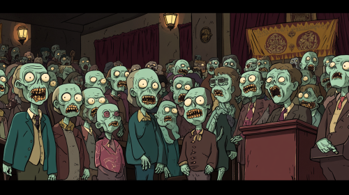 Create an imaginative and slightly humorous image of a massive assembly of Mexican zombies, all voting unanimously in favor. These zombies are stylized to resemble politicians but dressed like leftist university professors. The scene should include male and female zombies, depicting a diverse group. The setting is a large, dimly lit hall with elements of a traditional political assembly, such as banners and a podium. The zombies should have an exaggerated scholarly appearance, with glasses, disheveled hair, and academic robes, capturing a surreal yet politically charged atmosphere. The image should blend elements of horror with political satire, emphasizing the concept of unanimous decisions in a quirky, undead setting. --ar 16:9 --v 6.1