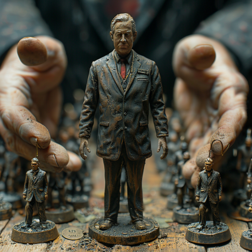 Show politicians as marionettes being controlled by large, faceless corporate hands. Each corporate hand has a subtle brand logo on the cufflink, representing the influence of money in politics. --s 750 --v 6.0