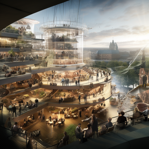 section through copenhagen parliament, empowered politicians deciding on new mandatory food systems plan, ancient paining mixed with architectural visualization style, gloomy light, food is being grown on the rooftop of the parliament building, it is copenhagen but has the reichstag dome where people walk and watch the politicians discuss, next to the politicians there is a civic assembly happening voting for new food laws