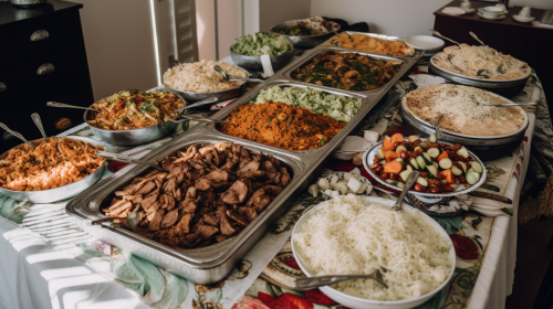 africanwedding food platters at wedding family house, reception party, township house south africa, Daylight, clean aesthetic, fujifilm --ar 16:9 --v 5.0