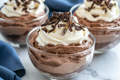 STYLE: Close-up Shot Top view | EMOTION: Tempting I SCENE: French dessert Chocolate Mousse A close-up photo of rich, creamy chocolate mousse in small glass bowls with layers and texture, topped with dark chocolate shavings viewed from the side, and garnished with whipped cream on top. The background is a white marble table with blue napkins beside it. | TAGS: High-end food photography, clean composition, dramatic lighting, luxurious, elegant, mouth-watering, indulgent, gourmet | CAMERA: Nikon Z7 | FOCAL LENGTH: 50mm | SHOT TYPE: Close-up | COMPOSITION: Top view Centered | LIGHTING: Soft directional light | PRODUCTION: Food Stylist --ar 3:2