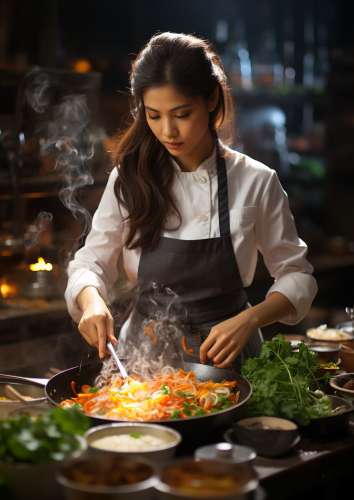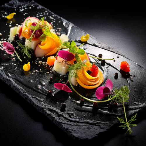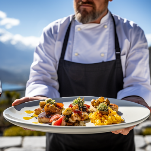 A close photo of a chef arms serving gourmet plates, in a restaurant terrace, not much food, minimalist, exterior photography with mountains in the background, shellfish, golf courses in the background- inspired, elegant, yummy, vivid colors, nature, natural light, dslr, hq, 24mm